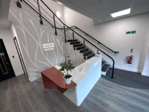 Parametric Walls created an eye-catching bespoke design for the reception area feature wall of Concept Cubicle Systems. This company specialises in washroom product innovation, working directly with architects, designers, and contractors to carry out the supply and installation of washroom solutions. They requested Parametric Walls help to create a lasting first impression to visitors, as they enter Union House. They also wanted to showcase their branding through this renovation project.